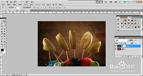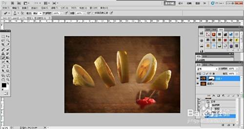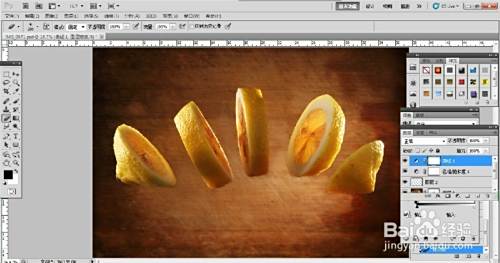 再新建一个空白层,用仿制图章来将留在柠檬上的残留的牙签修掉,这样即使复制错了,也可以用橡皮擦去,不影响原图。