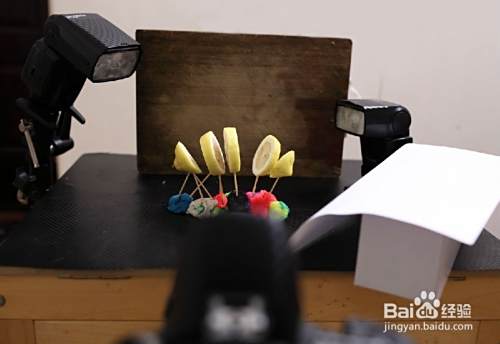 在拍摄过程中最为重要的是模拟光线,建议在拍摄前首先进行“试光”。两只灯头纷纷转向镜头方向。因为是拍摄小型主体,建议使用焦段变换灵活的24-70mm镜头,为了保证画面中的柠檬各个部分细节全部清晰推荐将光圈缩小,使用F14的光圈最为合适。将闪光灯分别进行设置,左灯输出量为1/64,右灯输出为1/16。拍一张看看大概效果,调整灯的位置跟角度来避免眩光的产生。相机平行于水果切片,在取景器里将砧板底部控制在画面下面,最好能出画面。然后手动对焦,把焦点调好后就可以拍摄观看效果了。需要注意到的是,拍摄满意之后,将拍摄主体移开,拍摄一张完整的背景砧板,一边后期调整。