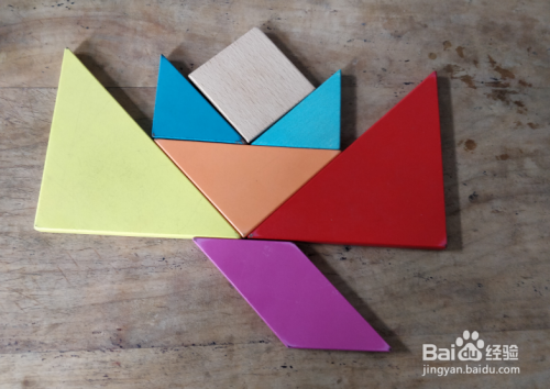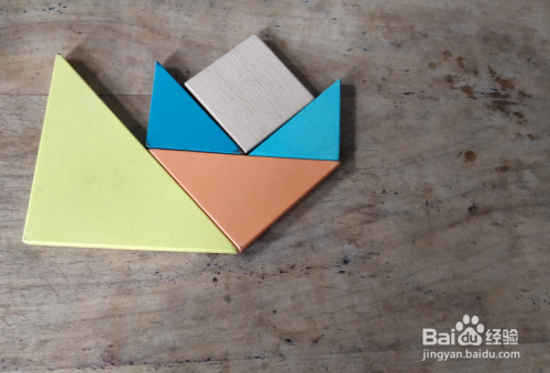 摆上正方形,放上蓝色三角形内侧挨着,如图。