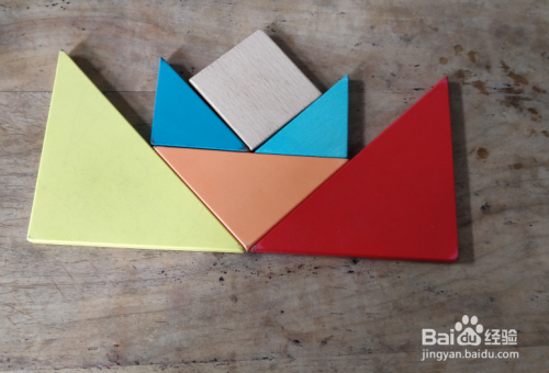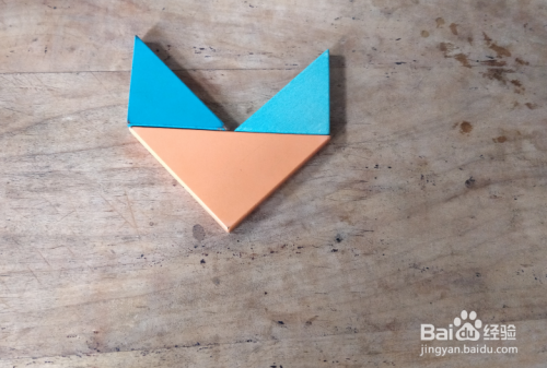 摆上橙色三角形,直角向下,上面摆上蓝色三角形挨着,如图。
