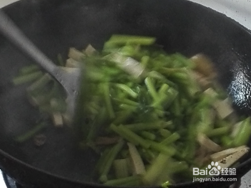进行翻炒,观察芹菜颜色的变化,等待颜色变成翠绿的时候放入食盐,准备装盘上桌。
