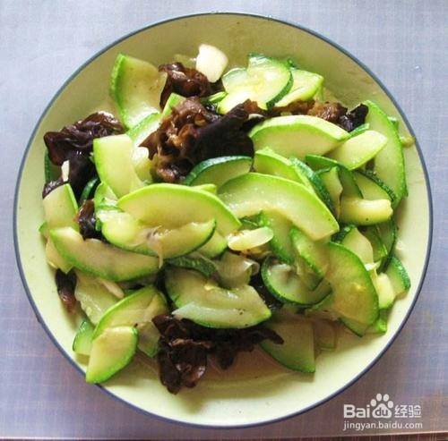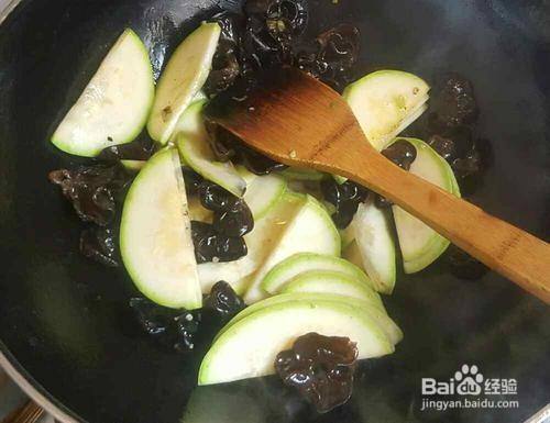 锅内放入少许油,放入葱花蒜末爆香,放入木耳和西葫芦翻炒3分钟左右。