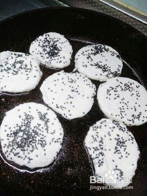 锅中刷油,放入饼坯,撒上黑芝麻,小火煎至两面金黄即可