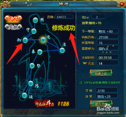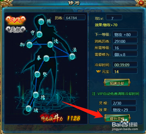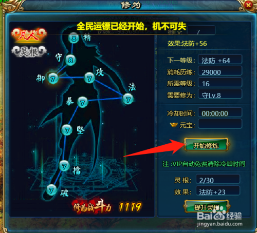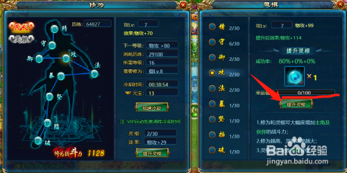 点击“提升灵根”,增加幸运值,幸运值满后相应灵根提升,增加战斗力。