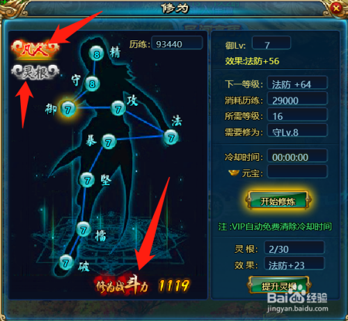 修炼之前请注意左上角“凡人”“灵根”,下边的“修为战斗力”等。