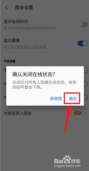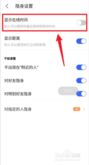 打开陌陌……设置……隐私……隐身设置……关闭显示在线时间。