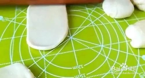小剂子两边切口处收口摁扁,然后用擀面杖把剂子擀成长形的饼坯。