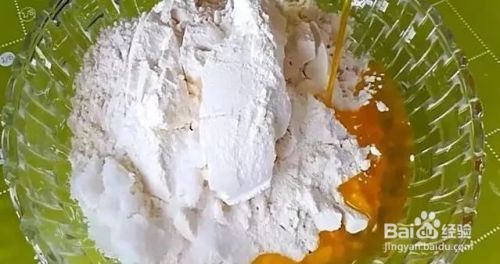 去一个小碗,放入20克面粉、10克白糖、倒入与面粉同等量的食用油,把它调成糖油酥。