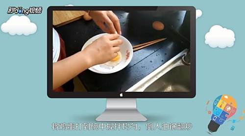 2将准备好的虾仁清洗干净,用刀剁成小块,将鸡蛋打到碗中搅拌均匀,倒入油锅翻炒。
