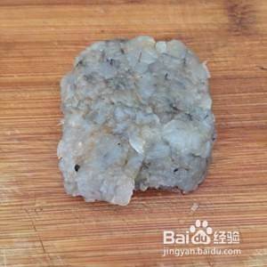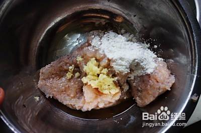 虾蓉加入鸡蛋清、料酒、糖、盐、胡椒粉、香油、姜末少许,生粉适量