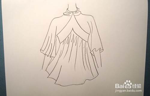 用铅笔在白纸上,画出高领长袖女装的草图,接着用黑色彩铅笔绘画出高领长袖女装的高领图形部分,如下图所示。