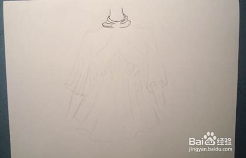 接着,用黑色的彩铅笔画出高领长袖女装的搭配长裙子图形,并画出裙子上花边线条,如下图所示。