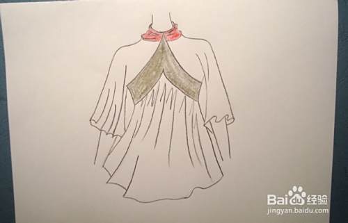 然后,用红色彩铅笔给高领长袖女装的高领涂上颜色,注意颜色要涂均匀,这样好看些,如下图所示。