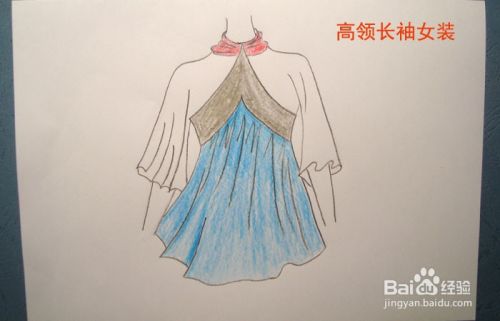 最后,用蓝色彩铅笔给高领长袖女装的裙子图形涂上颜色,注意颜色要搭配好看,这样高领长袖女装就画好了,如下图所示。