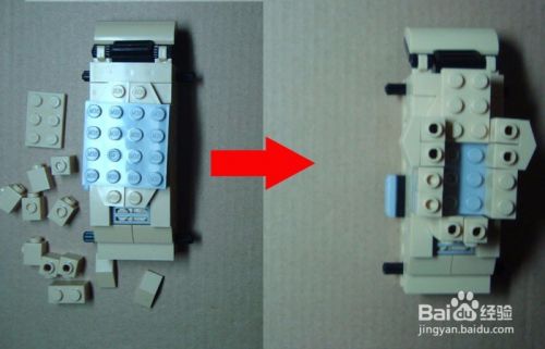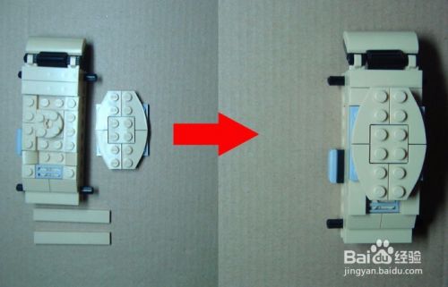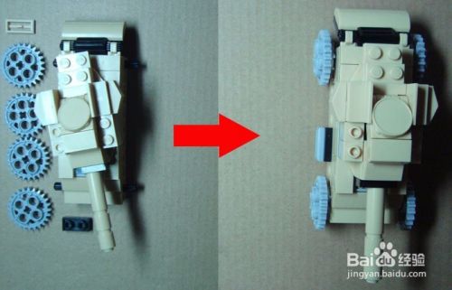 然后拼装小坦克的车顶的炮台。由一些零件积木所组成。左边是组装所需的零件组成,右边是装好后的整体结构效果。
