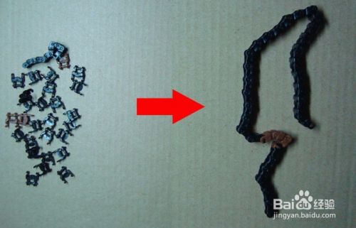 拼装好小坦克的履带部分,由一些零件积木所组成。左边是组装所需的零件组成,右边是装好后的整体结构效果。