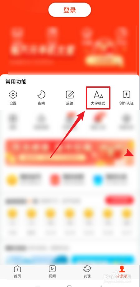 在登录界面(或个人中心)常用功能下,点击【大字模式】图标按钮。
