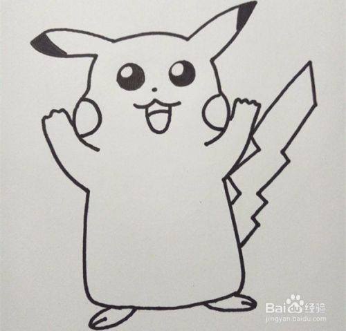 第六步,用勾线笔勾出皮卡丘的轮廓,需要涂黑的地方涂上黑色,再用橡皮擦去多余的铅笔印记。