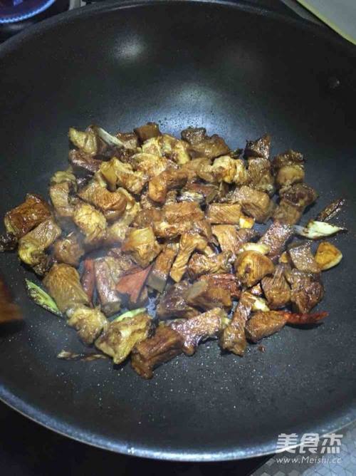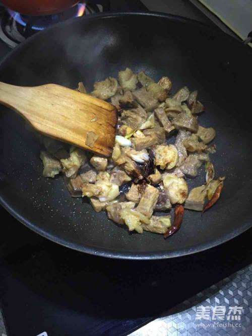 4翻炒至牛肉稍变色,倒入味极鲜,稍稍翻炒马上倒入老抽(老抽用于上色,根据颜色掌握用量)