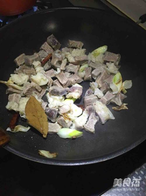 1将牛肉切成3厘米见方左右的块,凉水浸泡半小时后,锅中倒入凉水放入牛肉块,水开后焯约2分钟将牛肉捞出