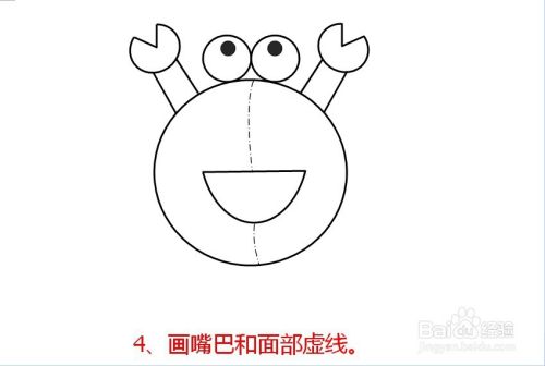 简单画螃蟹:画大圆->画圆眼睛->画钳子->画嘴巴和虚线->画八只脚即完成了。