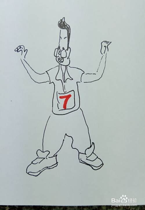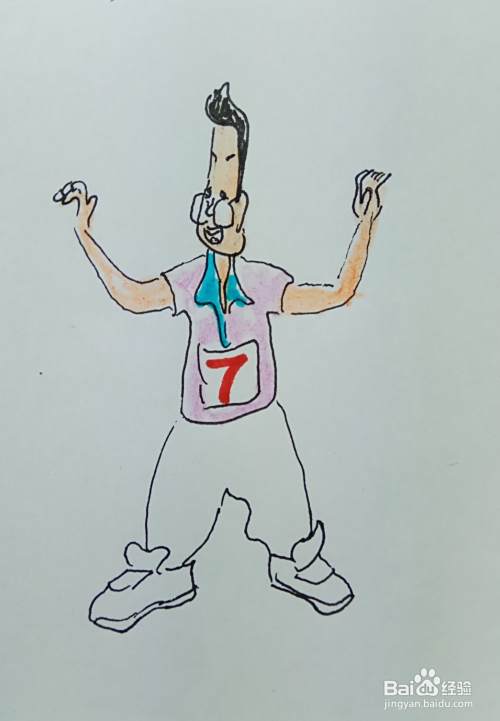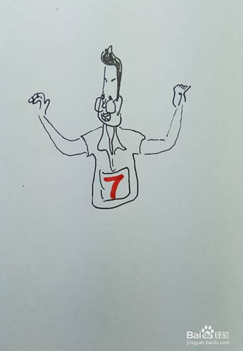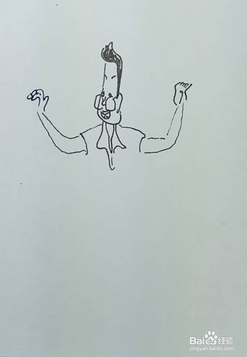 然后再画出他的肩膀和两个手,他举起了两个胳膊,再用线条和曲线画出他的身体部分和身上穿着的衣服。