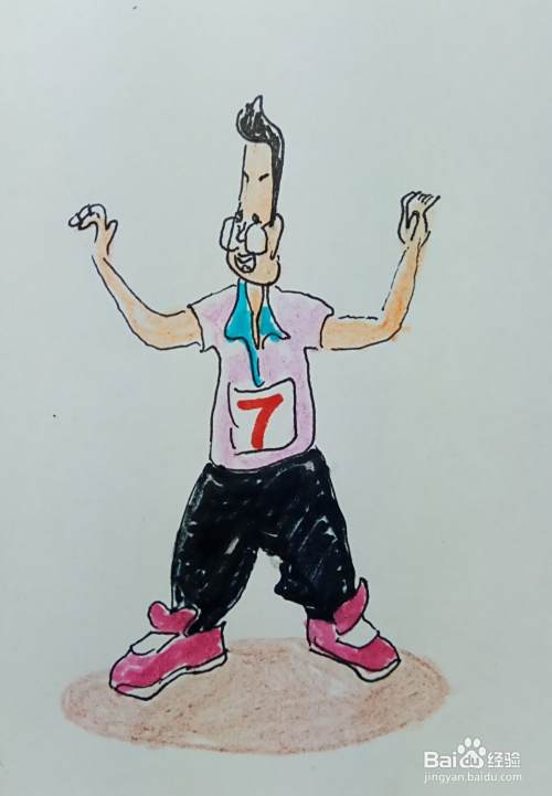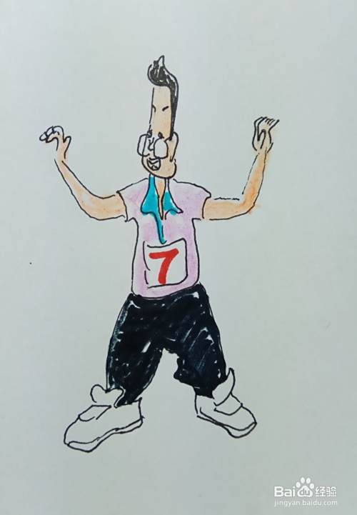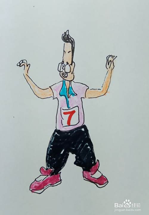 用线条和曲线画出他的腿和脚,用水彩笔涂出他的衣服色彩,再用水彩笔涂出他的皮肤色彩。