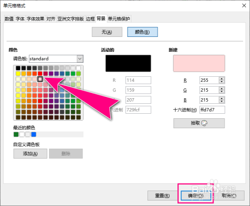 在"颜色"栏中,自定义选择一款背景颜色,再点击"确定"按钮应用生效。