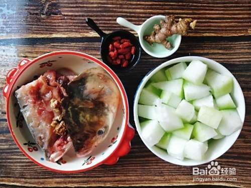 准备鱼头,枸杞,姜,冬瓜去皮切好。