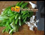 3芹菜斜着切段。如果用那种很粗的西芹,就需要顺长剖开。新蒜切末。