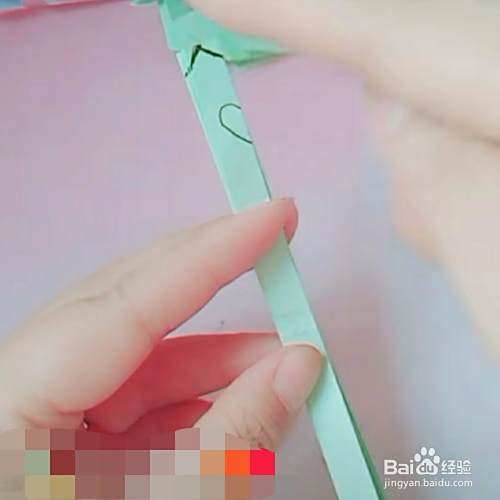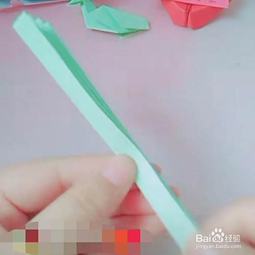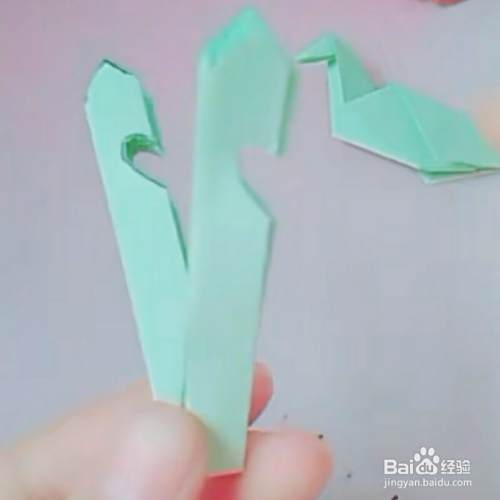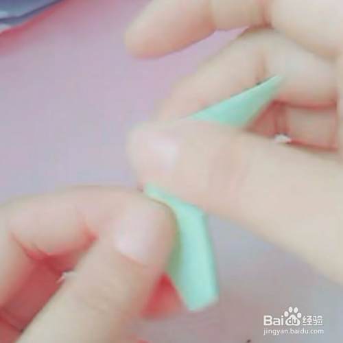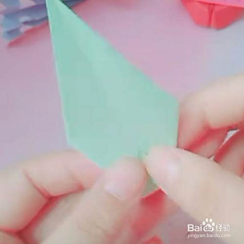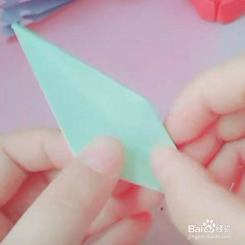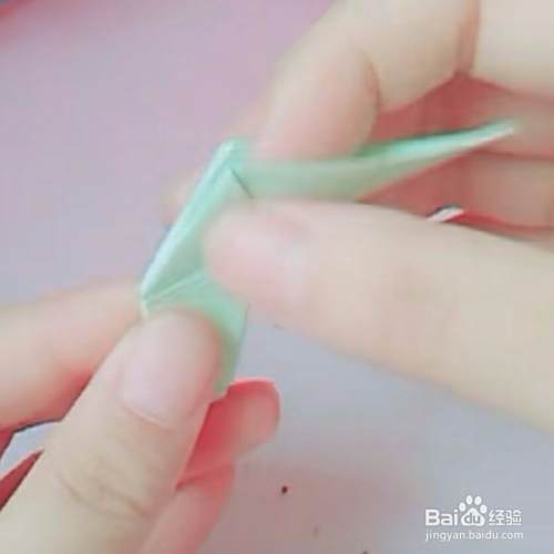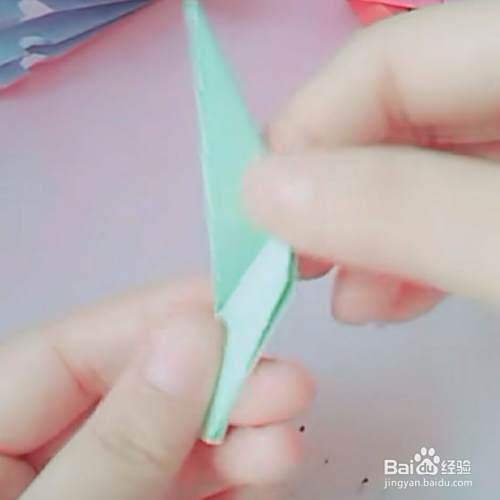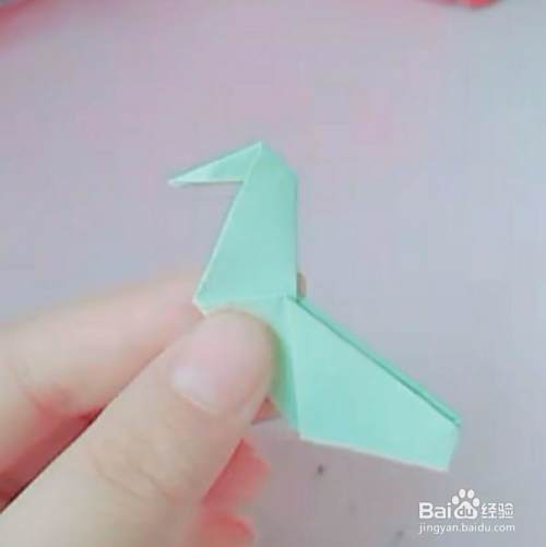 第四,把顶角如下图所示,微微向里折一下,这样一只可爱的孔雀嘴就做好了。