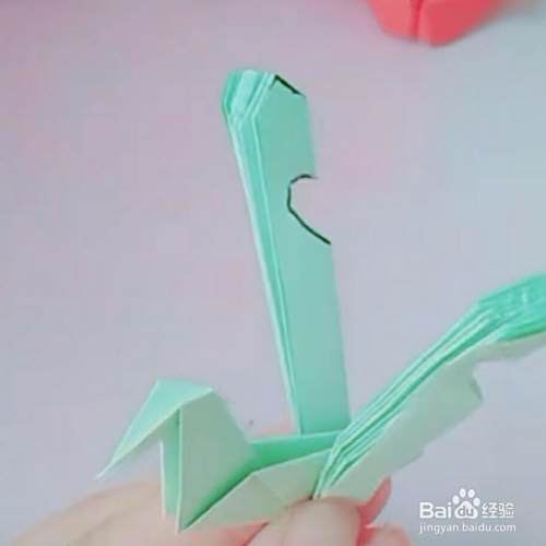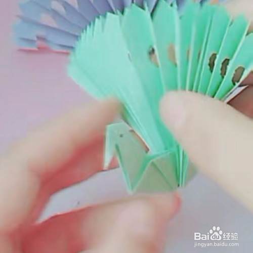 第七,用胶水把中间粘起来,如下图,然后再打开即可,用水笔给他点两只眼睛,这样一只可爱的小孔雀就折好了,喜欢的收藏点赞哦。