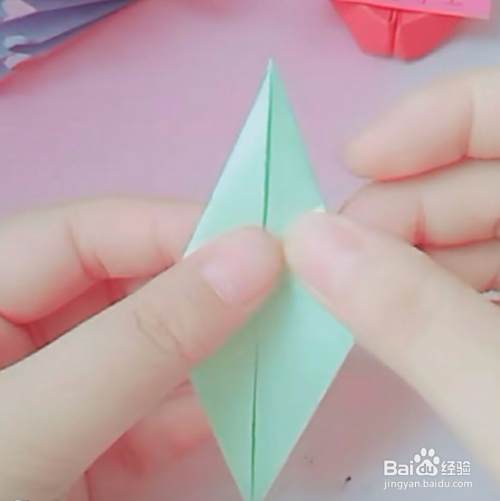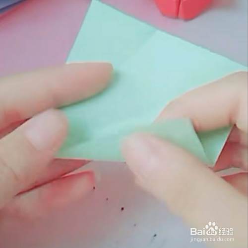第二,同理,对角两边也是沿中线向里对折,如下图操作,然后翻到背面,底角向上翻折,如图: