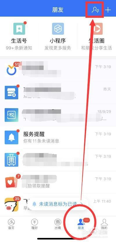 在”朋友“中,我们点击上方的【通讯录】图标,位置如图所示