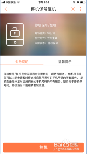 进入停机保号复机办理页面,点击【复机】;