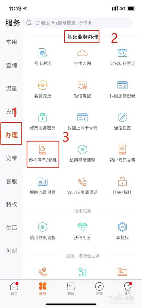 点击【办理】-【基础业务办理】-【停机保号/复机】;
