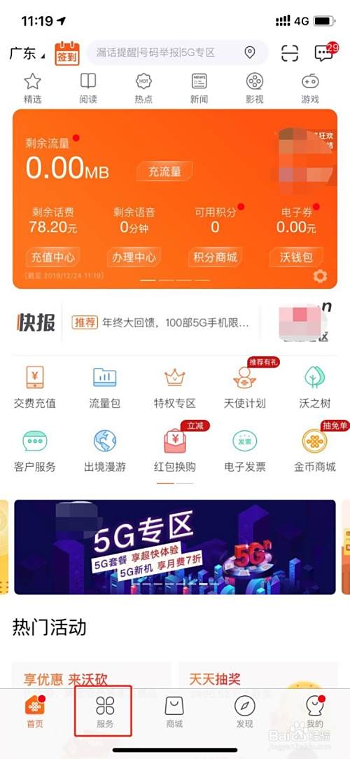 下载打开中国联通APP,点击下方【服务】;