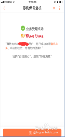 跳转至“业务受理成功”页面,停机保号复机页面成功办理。