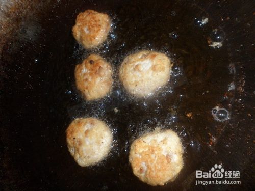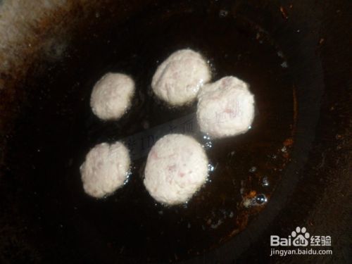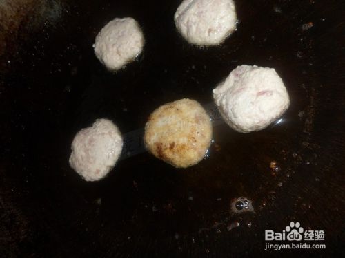 平底锅开中火,倒油,放进豆腐肉丸煎炸。