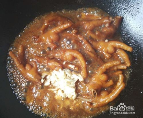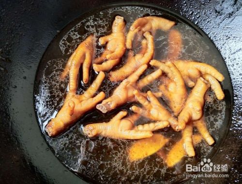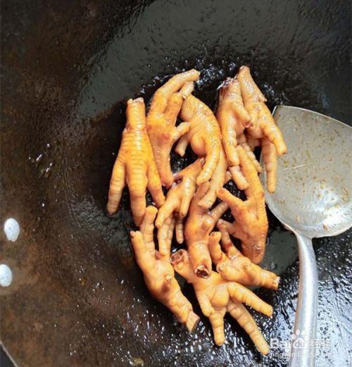 冷水放入鸡爪,加上料酒、生姜煮到沸腾后出锅过冷水备用。
