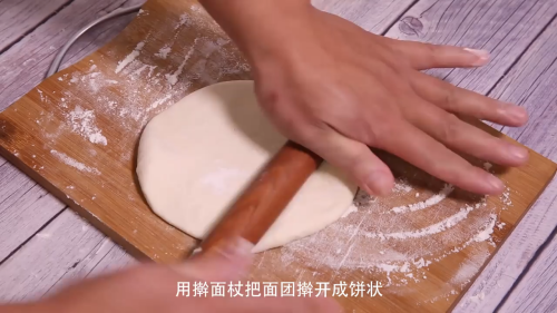 用擀面杖把面团擀开成饼状,倒上适量花生油,五香粉,涂抹均匀。