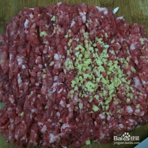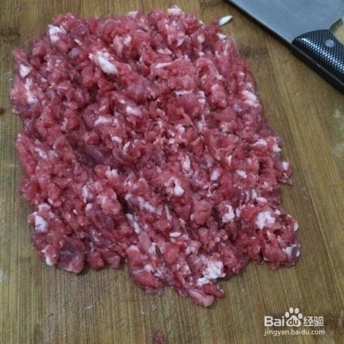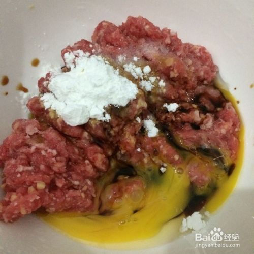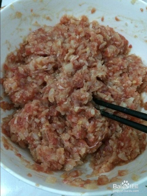 4 肉末加入调料后,朝一个方向搅动,让肉末上劲。