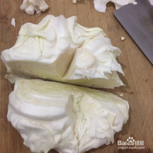 肉馅腌制的时候,我们来准备包菜。用小点的包菜,切2半,去掉中间的芯杆。