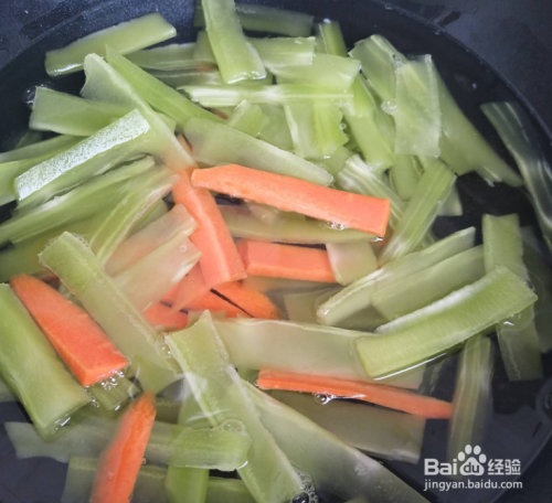 锅中加入清水,加入莴笋和胡萝卜片,焯水后捞起备用。