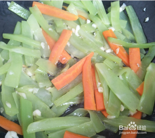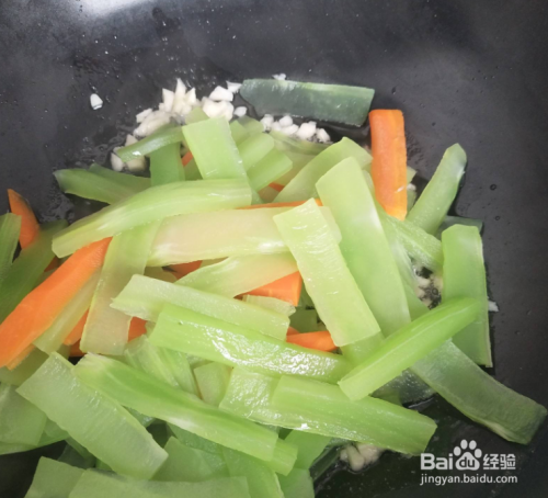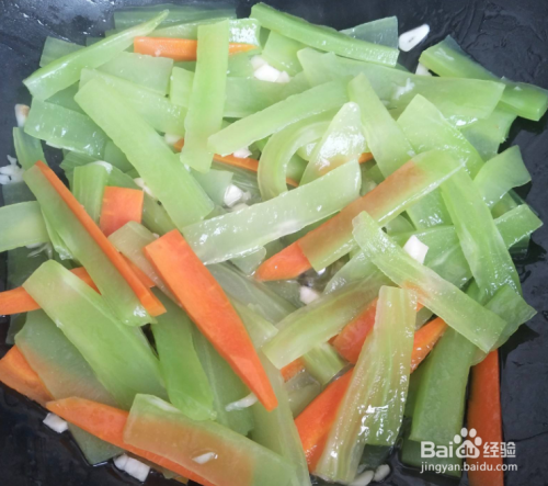 等大蒜烧出香味后倒莴笋和胡萝卜片一起翻炒。