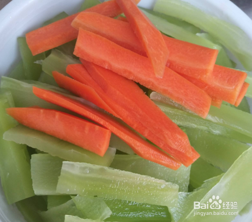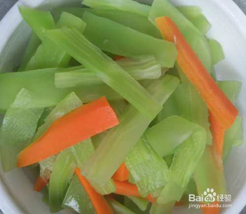 新鲜胡萝卜和莴笋去掉表皮,清洗干净切成片状备用。