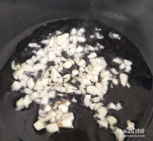 炒锅洗净,烧干水分,加入食用油,倒入大蒜翻炒。