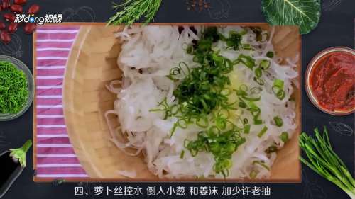 白萝卜切成片再切成丝,撒上少许盐,抓拌均匀。