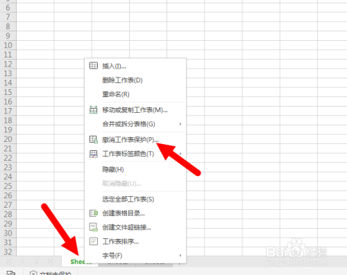 要想取消这一保护,使我们能修改表格。需要再次右击Sheet1标签,并从菜单中选择“撤消工作表保护”,如图。