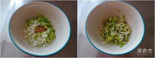 2葱花放入碗内,加入盐、植物油、十三香拌匀,腌一会儿